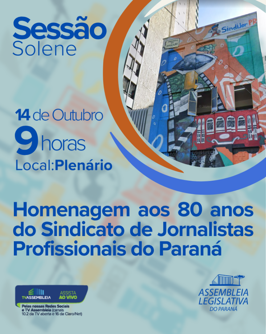 A Assembleia Legislativa do Estado do Paraná (Alep) promove no próximo dia 14, a partir das 9 horas, sessão solene em homenagem aos 80 anos do Sindicato de Jornalistas Profissionais do Paraná (SindijorPR). A iniciativa é do deputado Goura (PDT), cujo pai, Jaques Brand, é poeta e jornalista. Ainda na ocasião serão entregues menções honrosas a pessoas que fazem parte da história de luta e resistência do Sindicato.